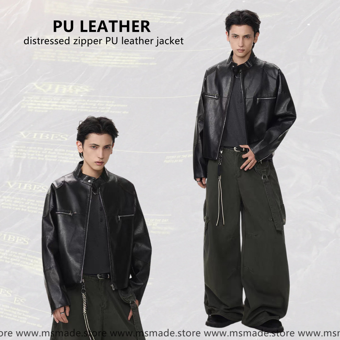 M334擦色拉鏈PU皮外套