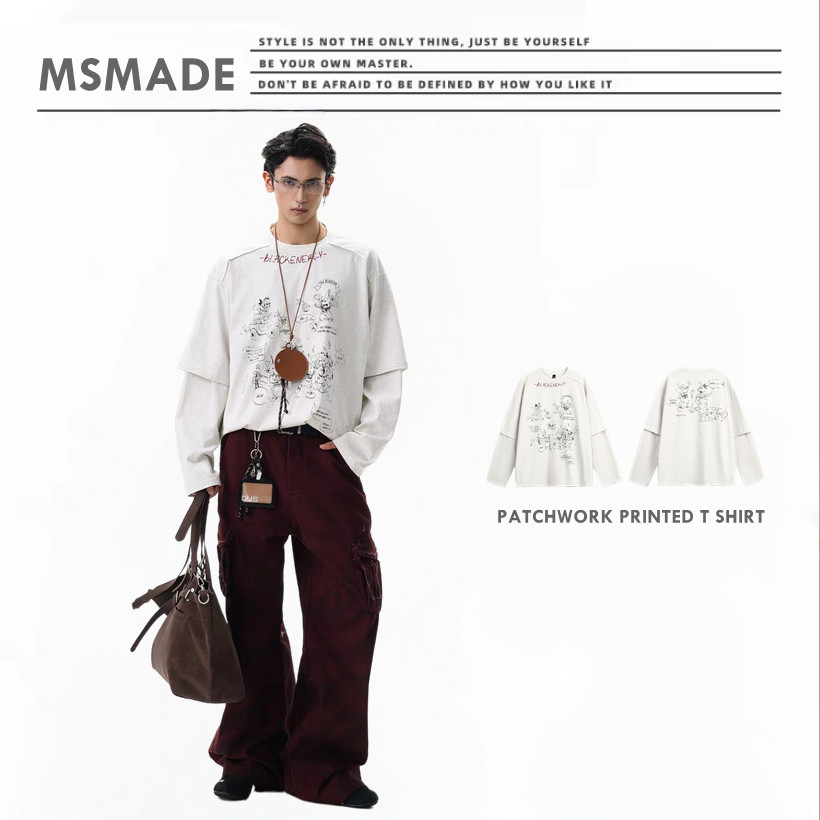 M103 拼接假兩件印花長袖T恤
