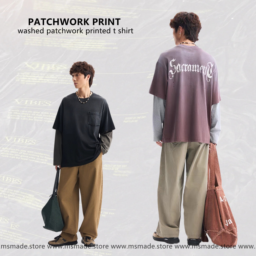 M506水洗假兩件印花長袖tee